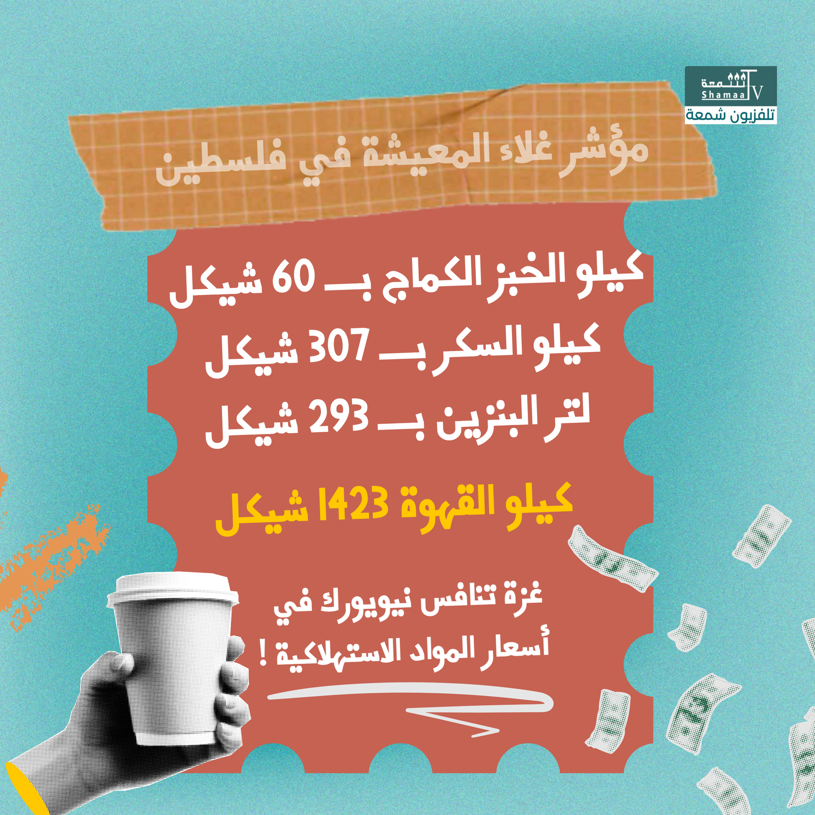 في غزة، الأسعار صارت كابوسًا يوميًا: كيلو الخبز الكماج بـ 60 شيكلاً، السكر بـ 307، لتر البنزين بـ 293، وكيلو القهوة قفز إلى 1423 شيكلاً. حتى الخضار والفواكه تحولت إلى رفاهية؛ الموز بـ 17 شيكلاً للواحدة، والبطيخ بـ 35 للكيلو.